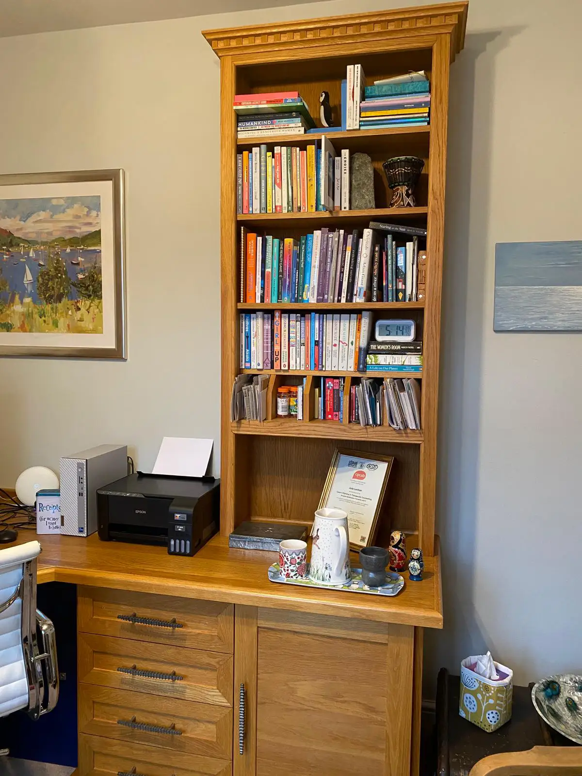 Bespoke wood finish office cabinet with shelves and custom draws.