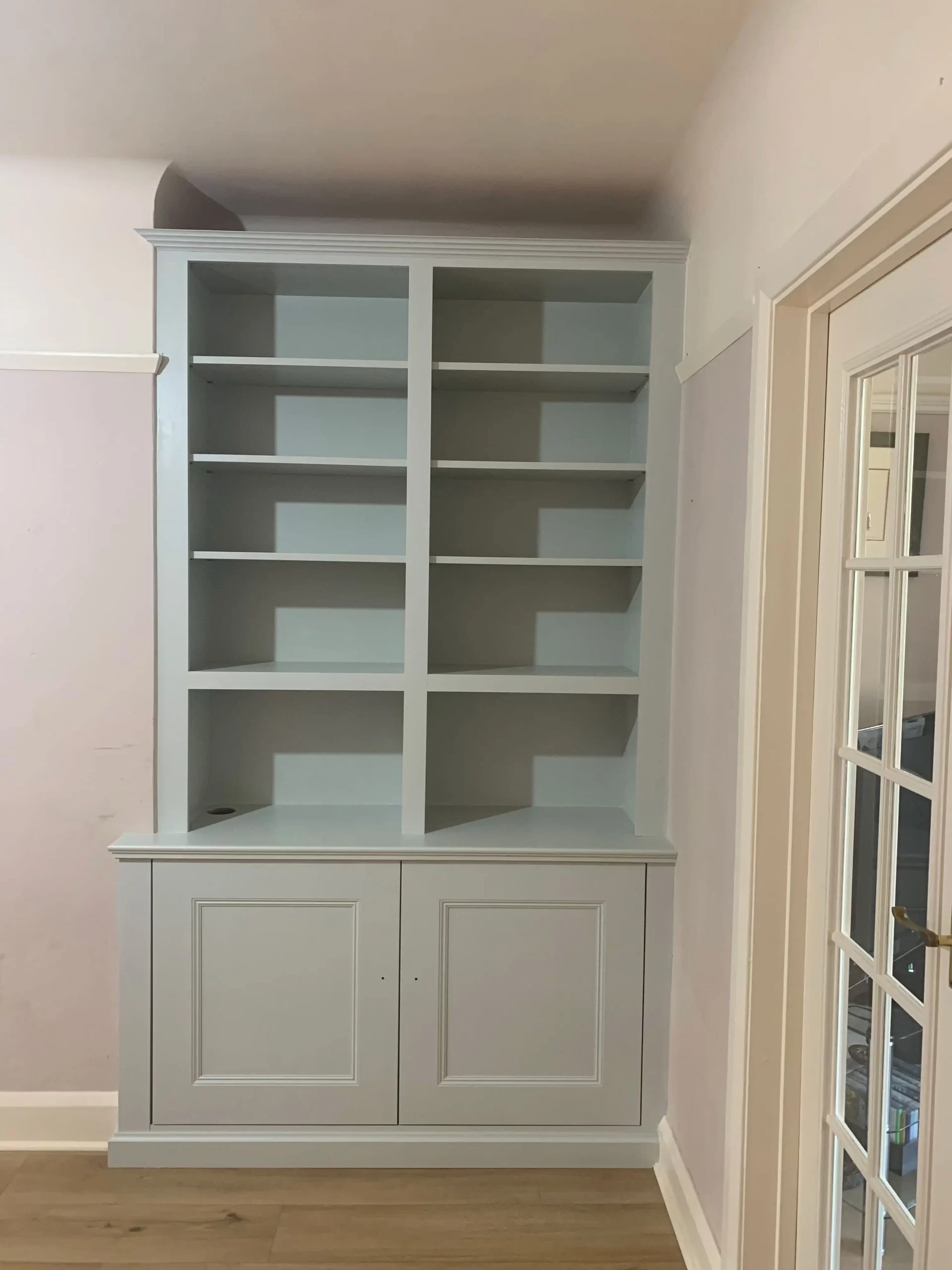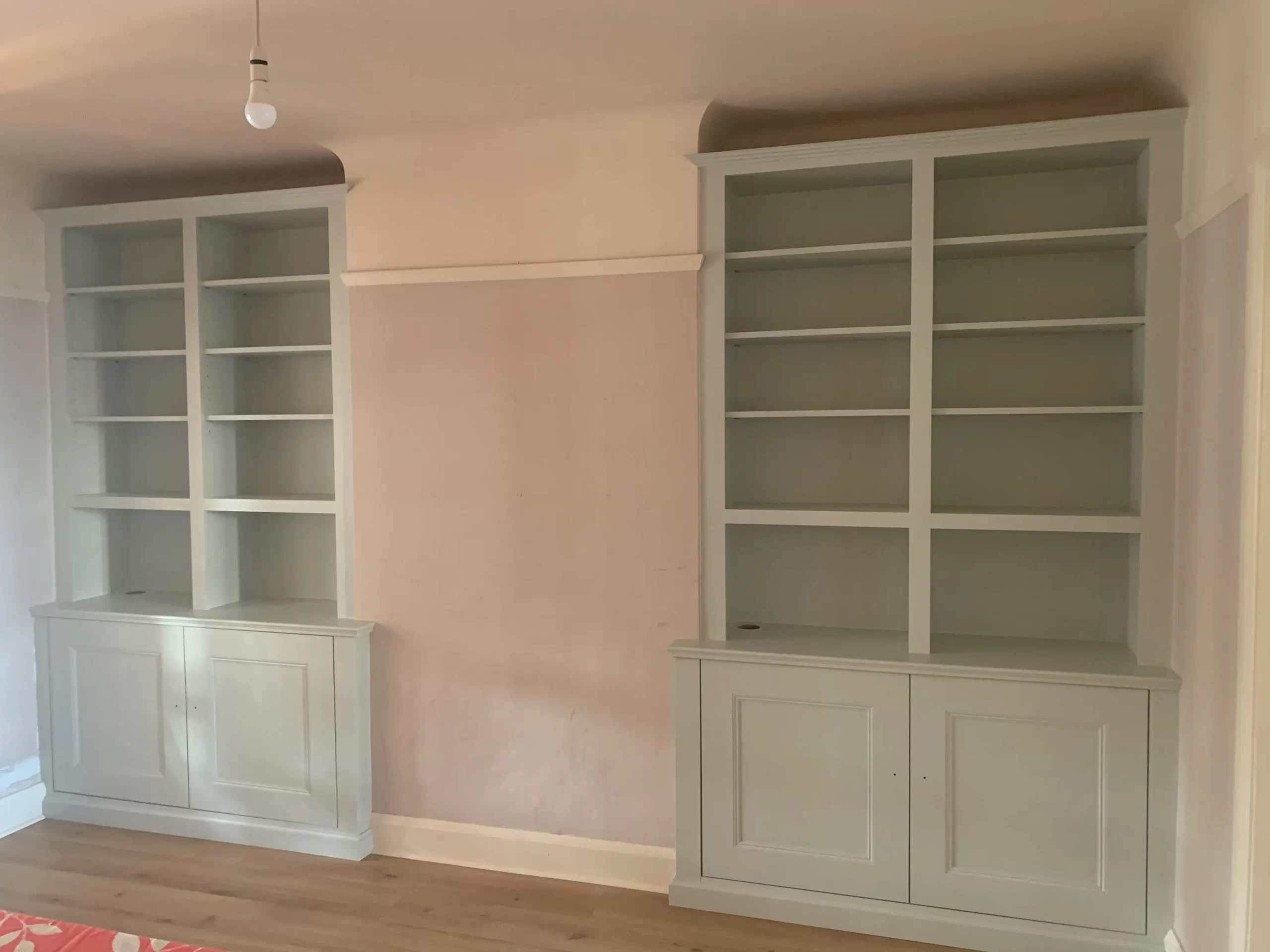 A pair of white built in base cabinets with bookcases above for display and books in Dulwich London.
