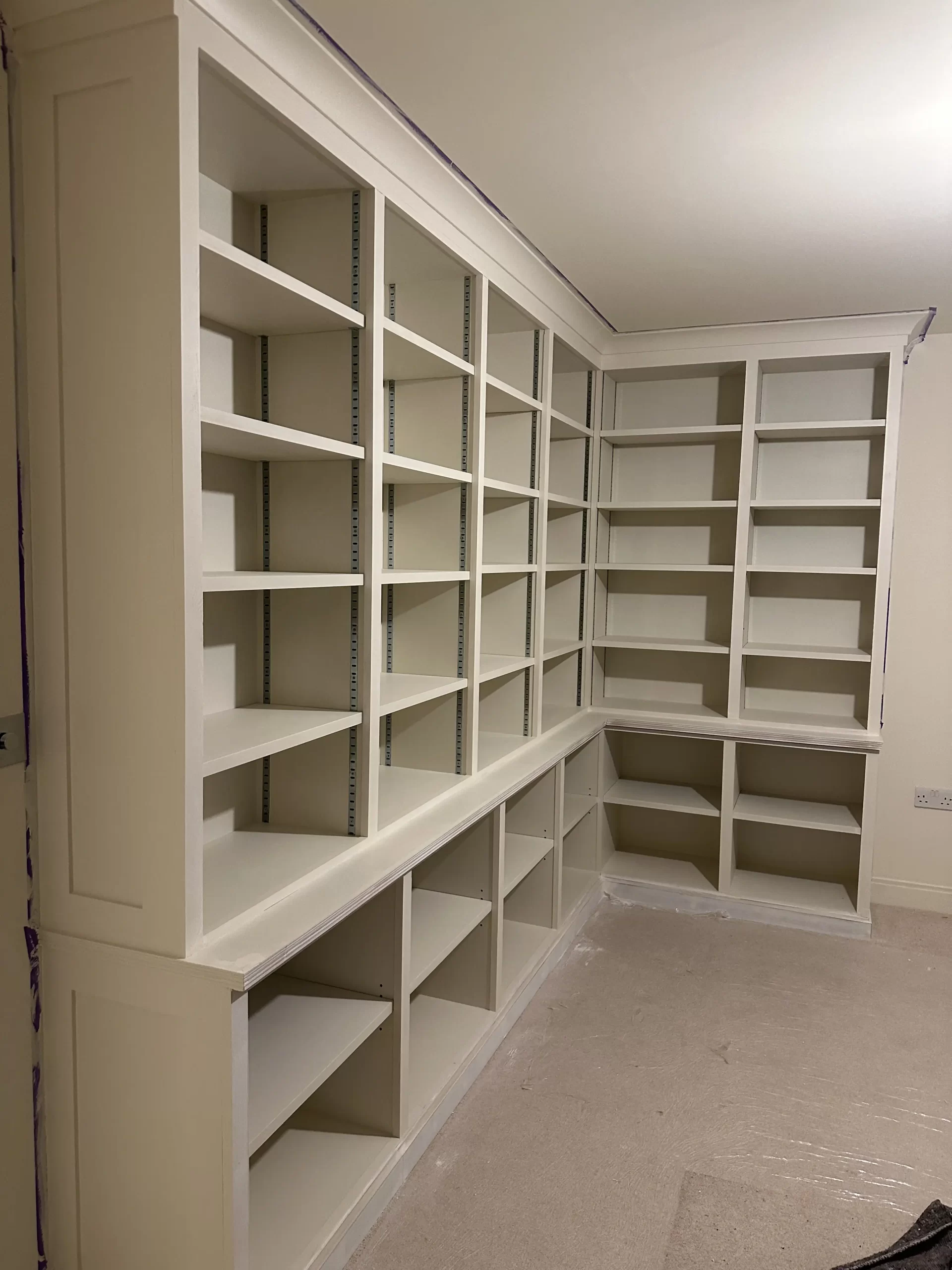 Freshly painted L-shaped fitted shelving unit with adjustable shelves, spanning two walls in a corner room.
