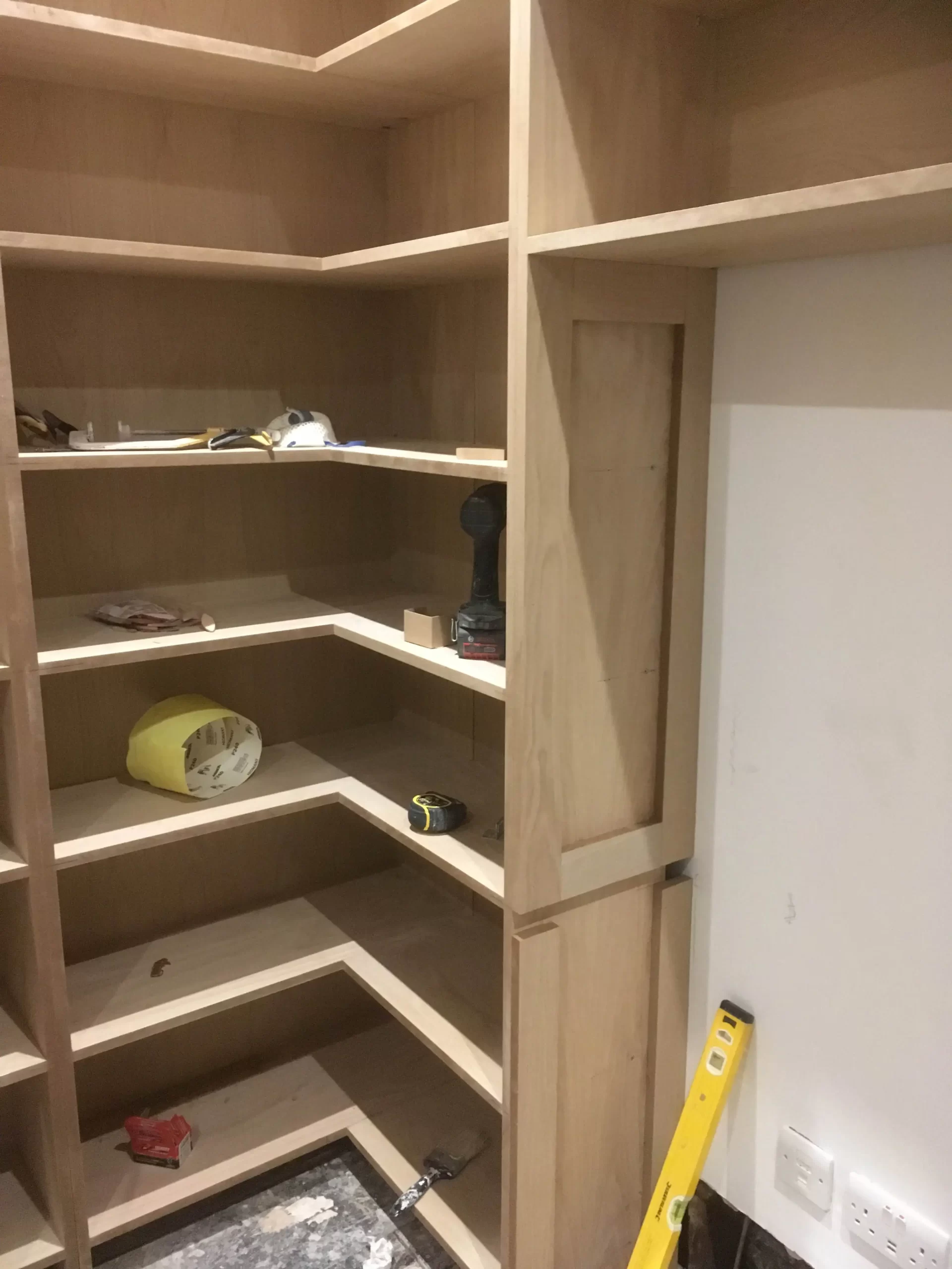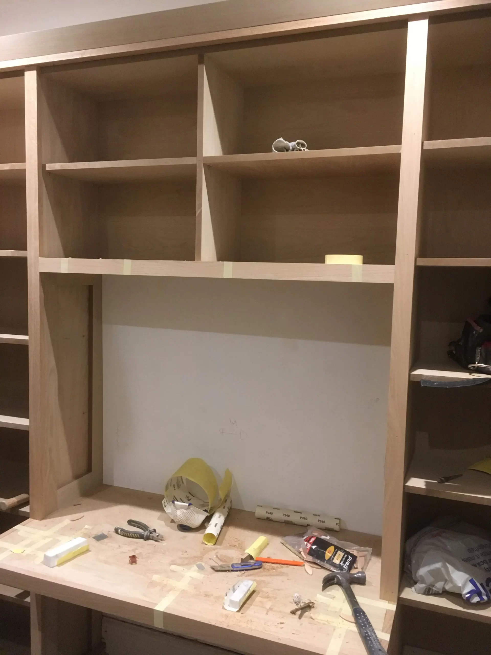 Light wood custom cabinetry in progress with various tools and materials inside open shelves.