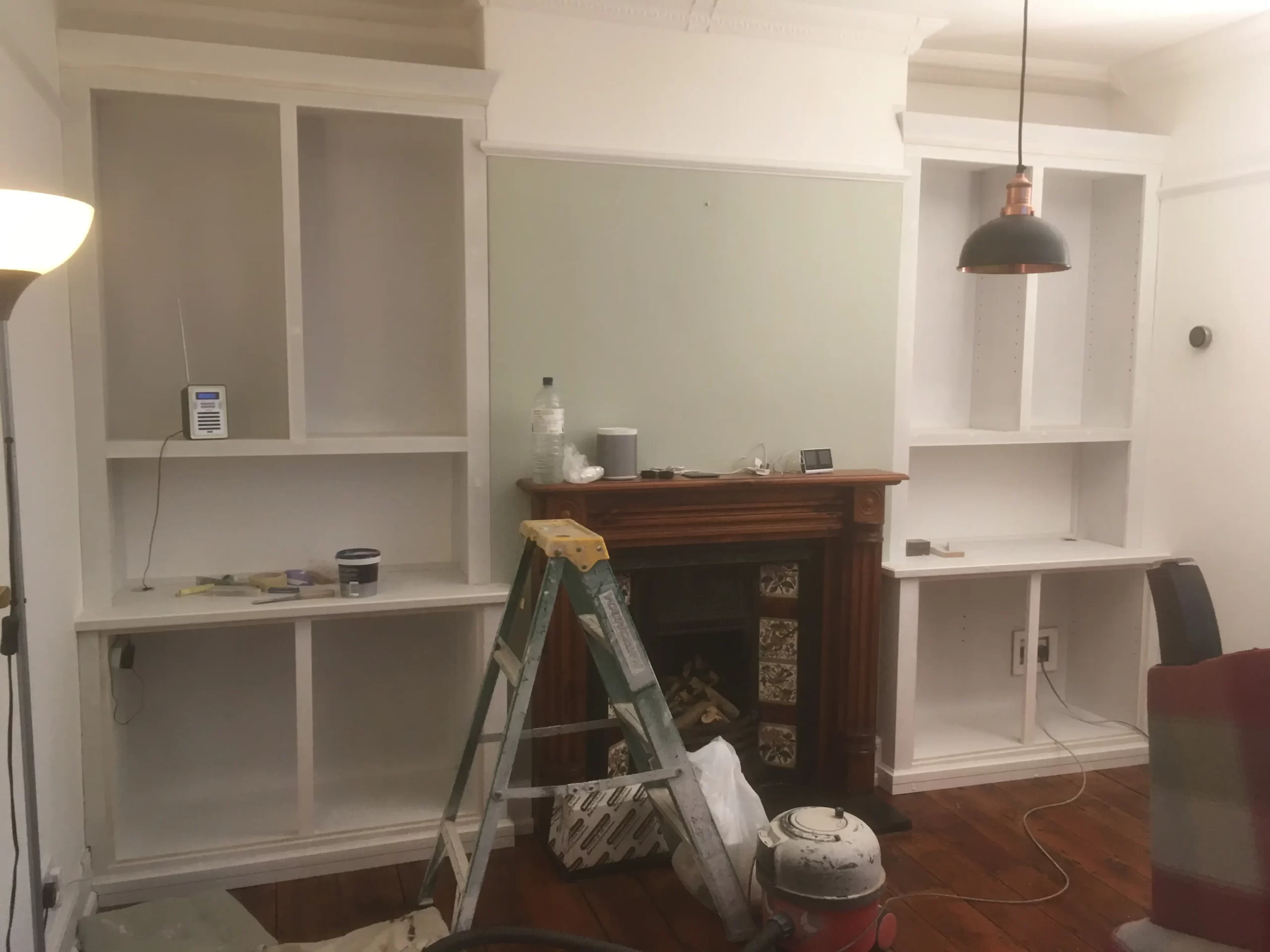 White built-in display cabinets on either side of a fireplace, mid-construction with tools and ladder in view.