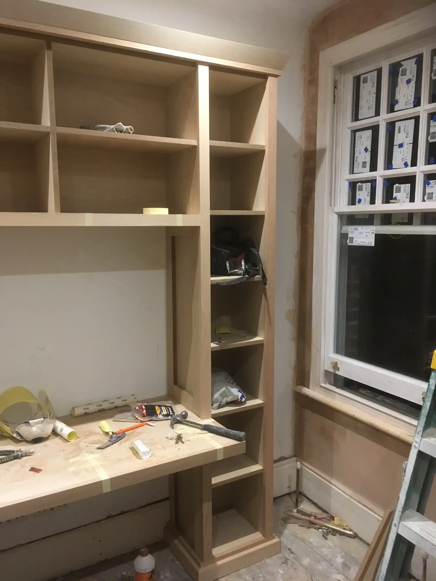 Light wood built-in cabinet with open shelving and desk space under construction, positioned next to a window.
