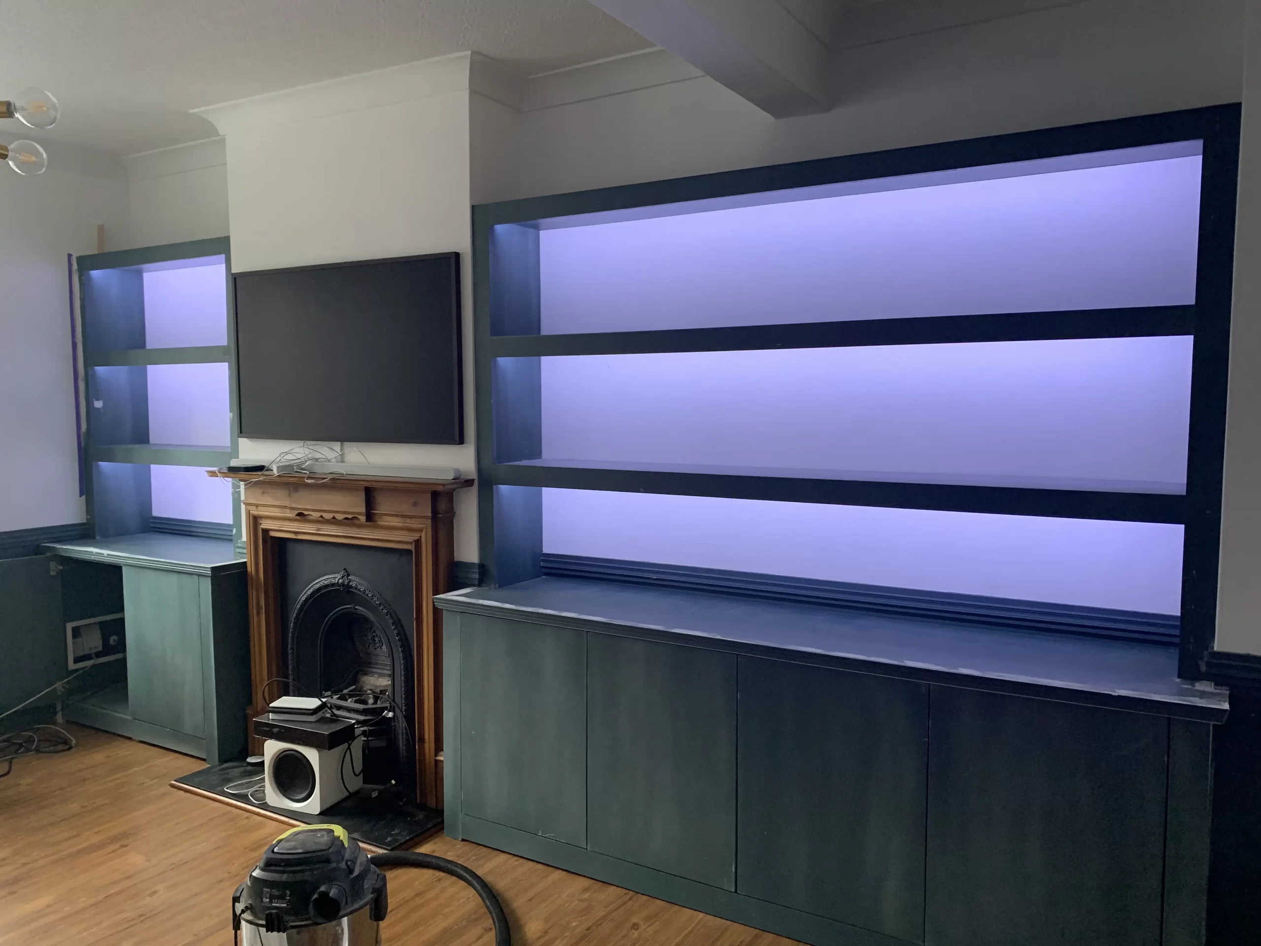 White built-in alcove cabinets with underlighting in progress around a blue wall fireplace, with tools scattered.