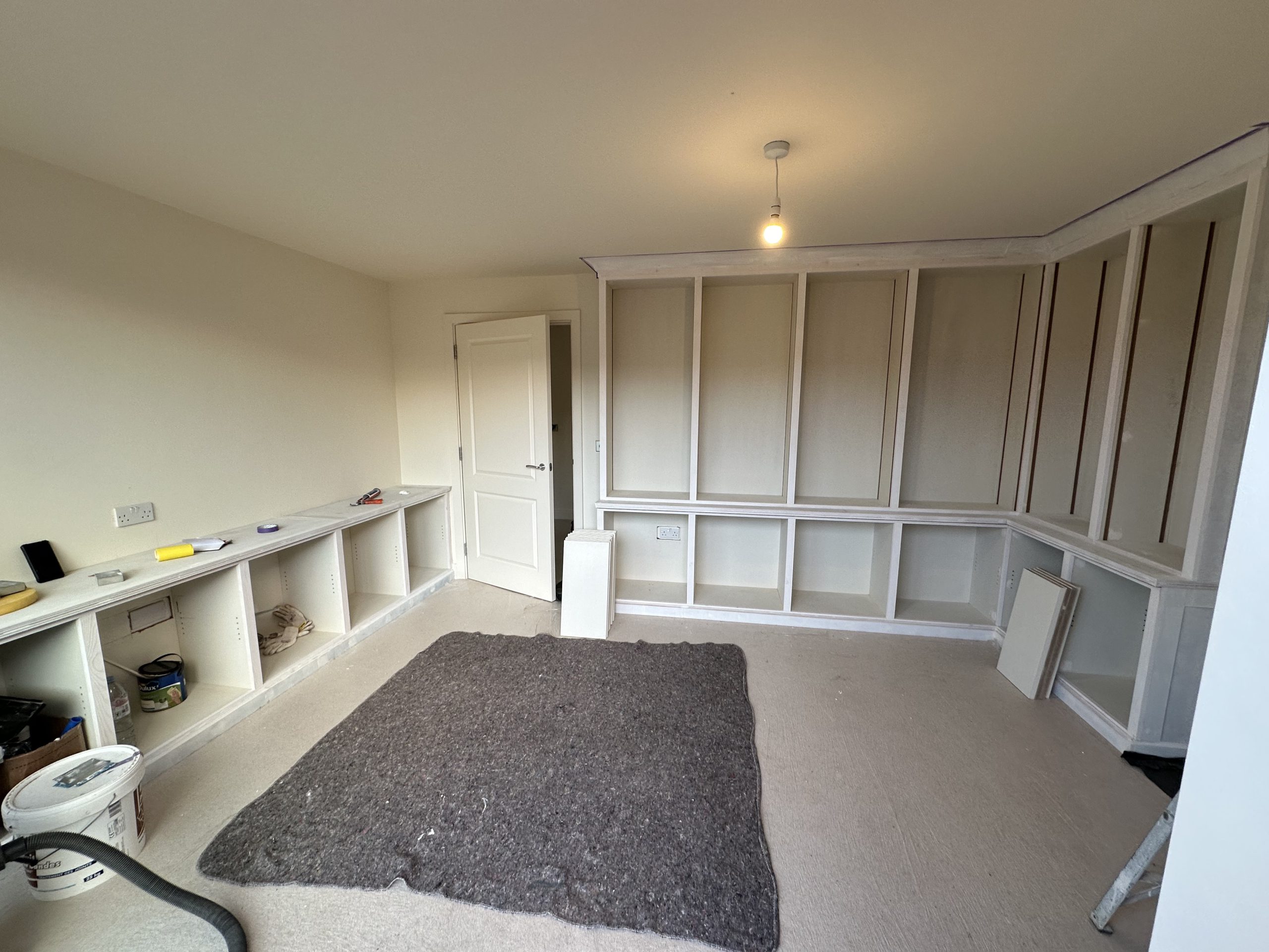 Room with large L-shaped fitted cabinetry under construction, with open base units, wall panels, and carpet protection.